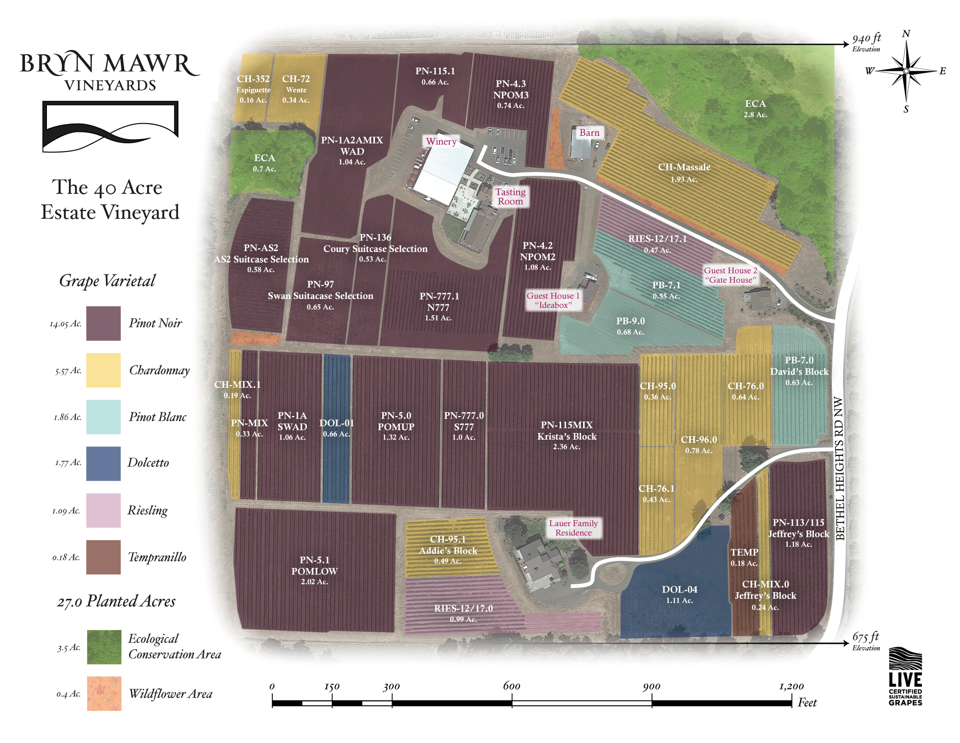 Bryn Mawr Vineyard is set apart by its uncommon elevation and dramatic exposure. Rising from 700 to 900 feet, our vines perch along the crest of a steep hill on the wild western edge of the ridge, with slopes unfolding to the east, south, and west. We gaze straight down the Van Duzer Corridor, fully exposed, thrust into the path of the wind. Each evening, as the cool air rushes in, our vines respond—preserving brightness and acidity, while crafting thick-skinned, tenacious grapes shaped by the elements.